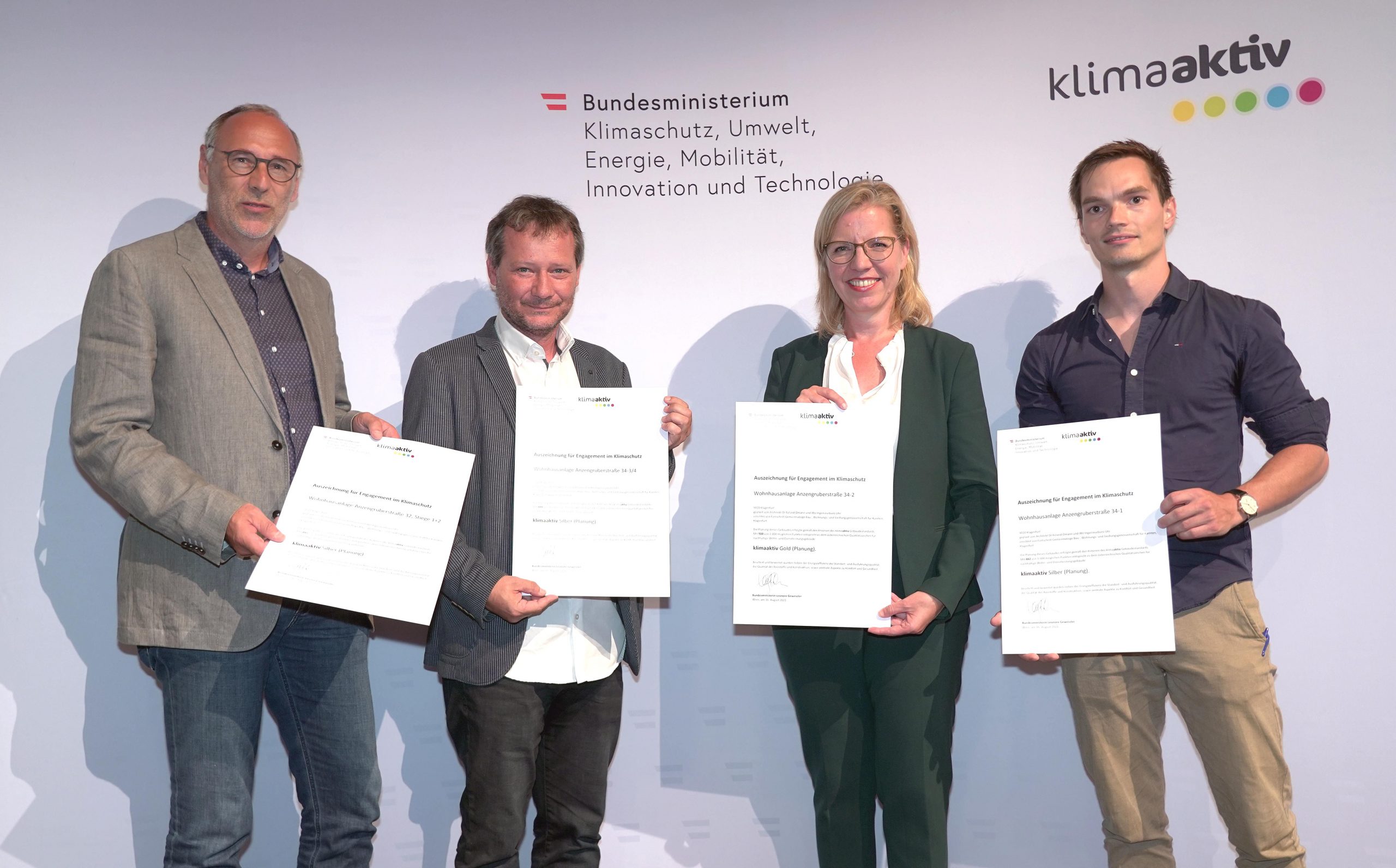Am 16.08.2021 zeichnete Klimaschutzministerin Leonore Gewessler am Gelände des Landesfeuerwehrkommandos in Klagenfurt insgesamt 13 fertiggestellte und 45 geplante Bauprojekte aus Kärnten für energieeffiziente und ökologische Bauweise nach klimaaktiv Standard des Klimaschutzministeriums aus.
