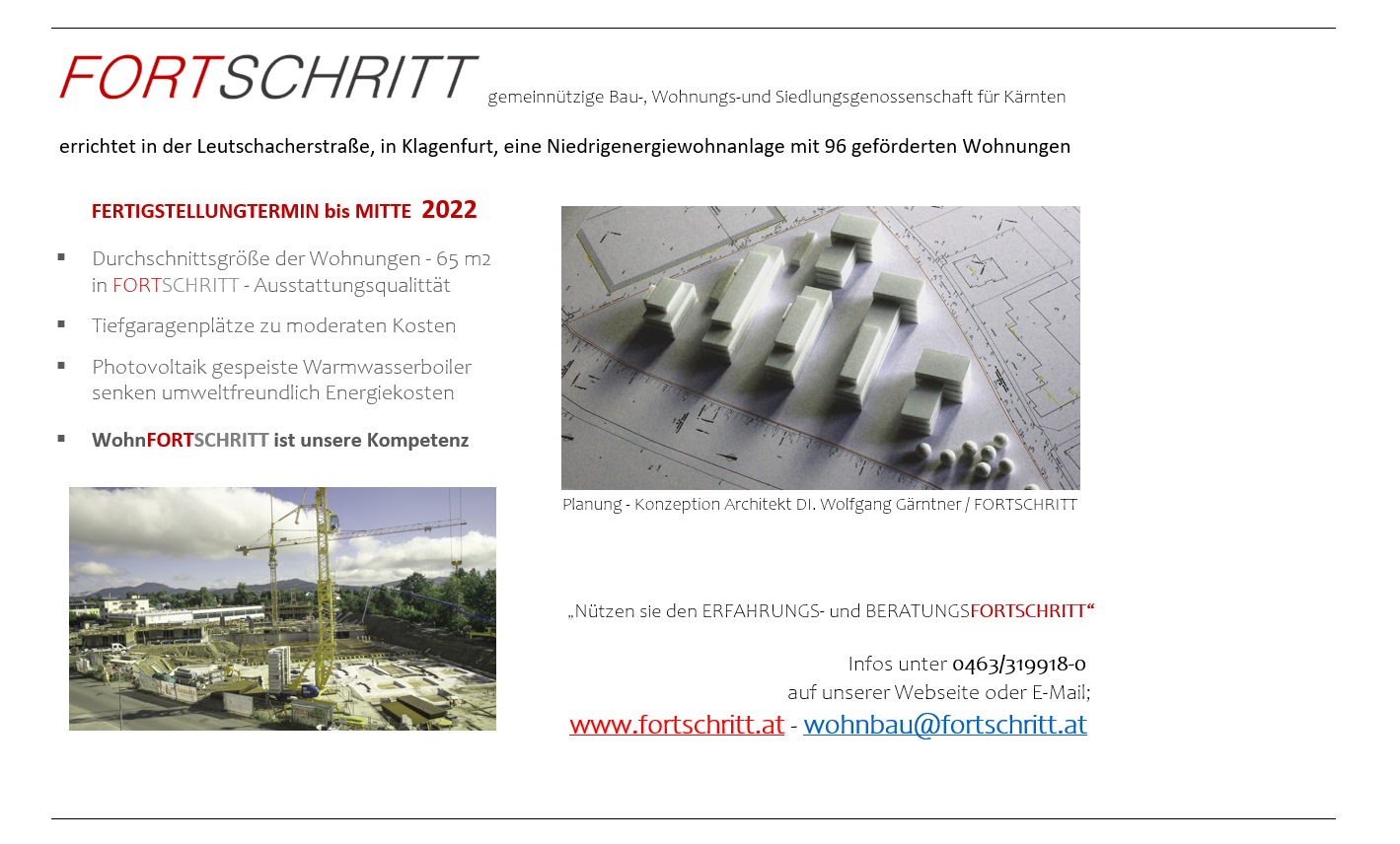 FORTSCHRITT errichtet bis Mitte 2022 in Klagenfurt am Wörthersee, in der Leutschacherstraße, 96 geförderte Wohnungen!