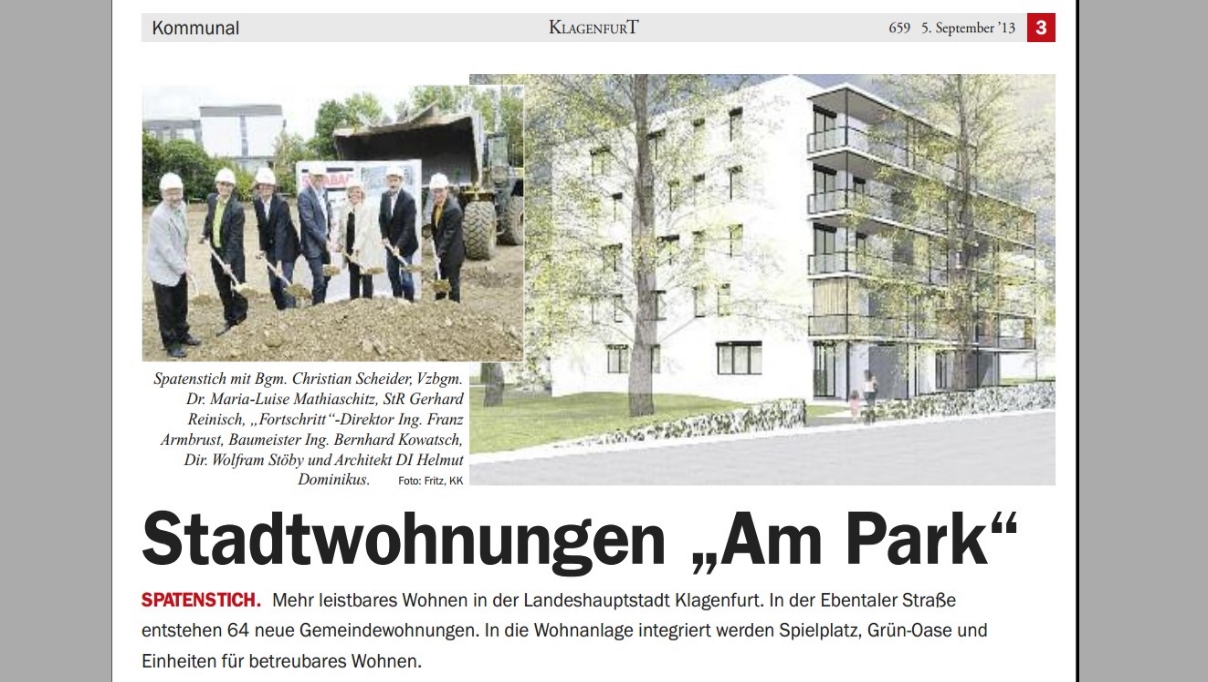Presseaussendung: StadtPresse Am ehemaligen ASK-Platz in der Ebentaler Straße wurden  Wohnungen der kürzlich fertig gestellten, ersten Baustufe übergeben.  Insgesamt entstehen auf dem Areal gegenüber dem Schulzentrum St. Peter in der Ebentaler Straße 64 neue Wohneinheiten. Nach nur eineinhalb Jahren Bauzeit wurden von Bürgermeisterin Dr. Maria-Luise Mathiaschitz und Wohnbaureferent Stadtrat Frank Frey gemeinsam mit Vizebürgermeister Christian Scheider die ersten 38 Wohnungen an die glücklichen Mieterinnen und Mieter übergeben. Der zweite Teil folgt im Herbst. Bürgermeisterin Dr. Maria-Luise Mathiaschitz dankte den FORTSCHRITT – Direktoren Ing. Franz Armbrust und Wolfram Stöby sowie Baumeister Ing. Erich Schöffmann. Die Wohnungsvergabe liegt ausschließlich bei der Stadt Klagenfurt.