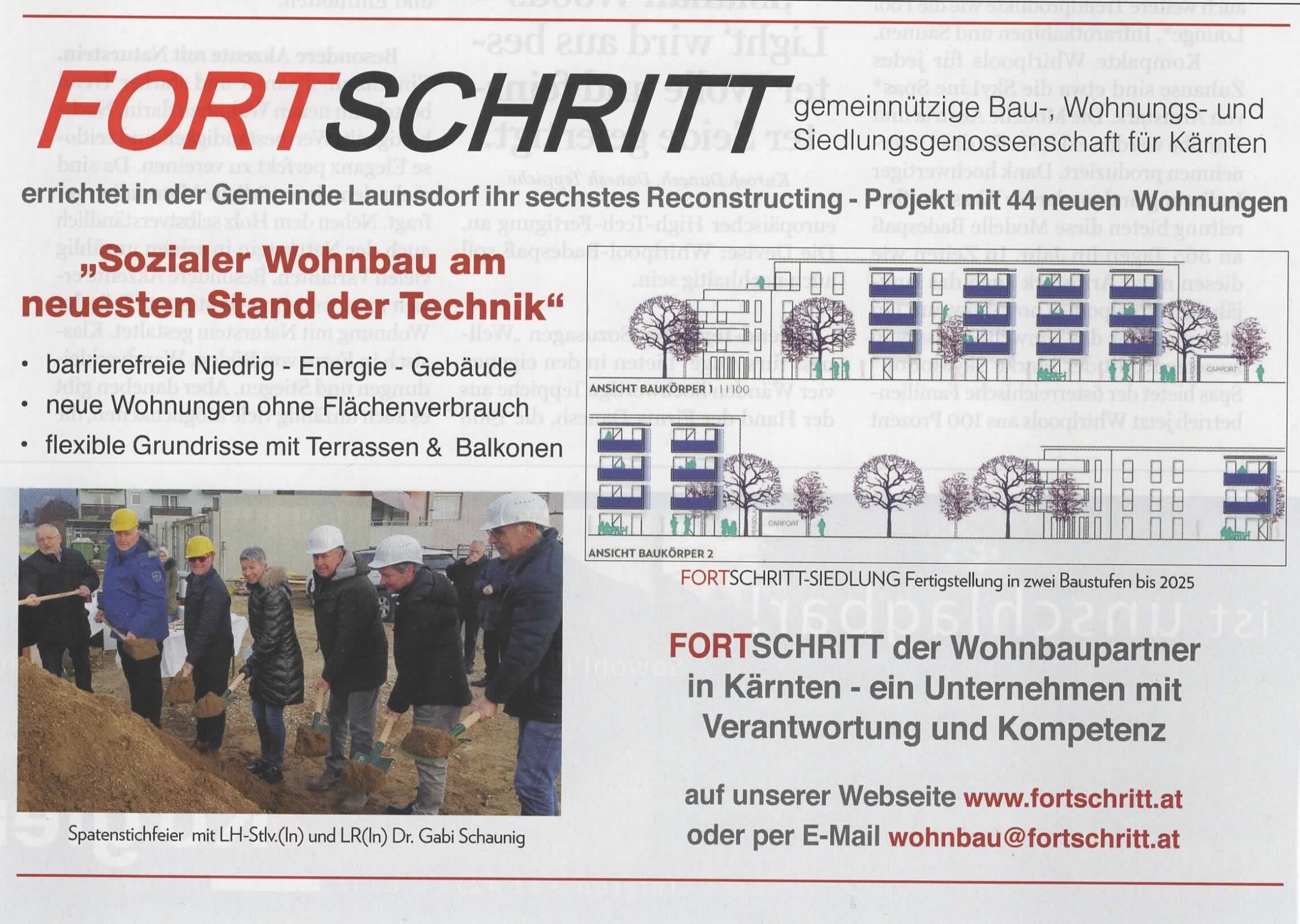 Am 14.12.2022 fand in Launsdorf die Spatenstichfeier für das nunmehr bereits sechste Reconstructing-Bauprojekt der Wohnbaugenossenschaft FORTSCHRITT statt. Bürgermeister Wolfgang Grilz betonte die Bedeutung dieses Wohnbauprojektes für die Gemeinde Launsdorf, bei dem in zwei Bauabschnitten 44 neue und hochwertige Wohnungen mit einer durchschnittlichen Größe von 66 m2 errichtet werden und freute sich gemeinsam mit seinem Amtsvorgänger Altbürgermeister Konrad Seunig, nach Abschluss aller notwendigen Bauverfahren, auf einen Baubeginn noch in diesem Jahr. Landeswohnbaureferentin Dr. Gabi Schaunig hob die Bedeutung des sozialen Wohnbaus in Kärnten,  ohne dem erschwingliche Wohnungsmieten nicht möglich wären,  hervor und verwies auf die hohe Kompetenz der Wohnbaugenossenschaft FORTSCHRITT bei diesem Ressourcen schonenden Bauverfahren ohne zusätzlichen Bodenverbrauch. Gemeinsam mit der bauausführenden Firma Haider & Co sollen gemäß FORTSCHRITT – Dir. Ing. Franz Armbrust und Architekten DI. Roland Omann die beide Bauabschnitte 2024 und 2025 realisiert und bezogen werden.